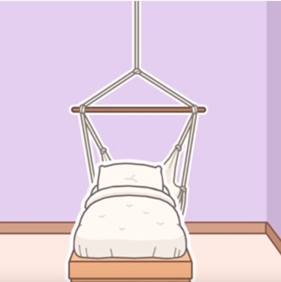 再来一个柜子把另外一边遮挡,等会儿还可以放东西,再来一个吊床,再来一个绿植吧,星星灯也来一个,最后放上自己喜欢的装饰品