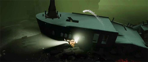 2、看到沉船之后,小伙伴们继续向沉船内部飞,一直飞到沉船第二层的船舱上就可以了;