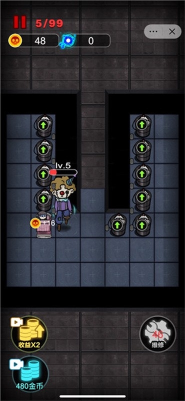 按前文时间及时升级炮台,攒钱升铁门到5级。接着把床收益升至每跳+32,4个炮塔可守鬼。