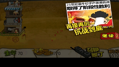 钉子户大战拆迁队是一款曾经红极一时的经典策略塔防小游戏,相信很多朋友以前都玩过,现在移植到手机上了。在游戏中你需要花钱召唤家丁,让这些家丁对抗拆迁队,从而保护好你的房子和宅基地,游戏玩法上有点像植物大战僵尸,但是风格却大不相同。