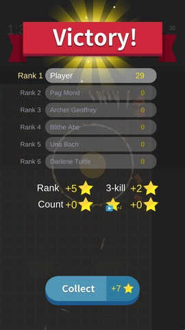 在游戏中我们将进入一个限制区域,通过收集散落的飞刀来增加自己的战斗力,然后与其他玩家进行碰撞,最终活下来即可获胜。