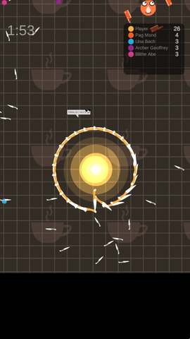 对于成长型io游戏来说,精髓就是在于“反杀”机制的设计了。游戏的基本游戏机制是“换血”——捡飞刀,碰撞,刀飞出。而这种游戏机制留下了更多的操作空间,比如说“捡刀”:如何在碰撞中拾取更多飞出的飞刀。