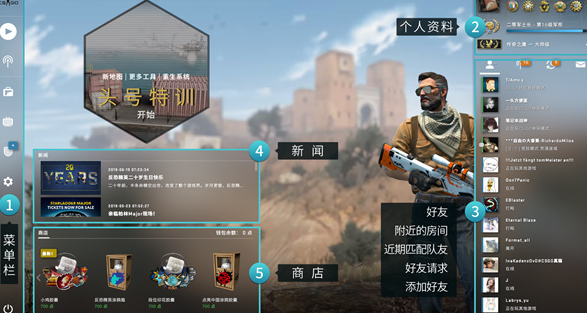 1、主界面:点击主面板(左上角CS:GO图标),无论在哪个栏目均会回到如图的CS:GO主界面。