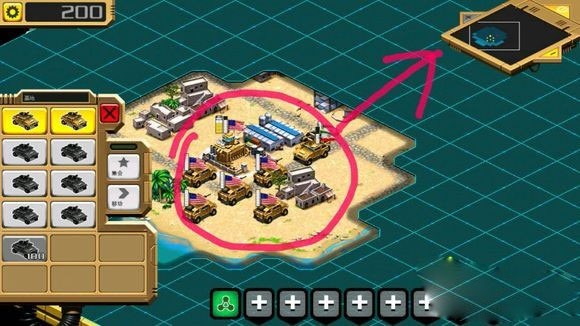 可见的陆军单位包括悍马(工程吉普车),坦克,大炮,机械(维修车),防空导弹车。海军则是炮舰(驱逐舰),巡洋舰,潜艇,运输船(空载航母),运输(运输艇)。空军则是战斗机,直升机,运输机。(不得不说部分翻译的名很奇葩,不过不影响游戏体验)