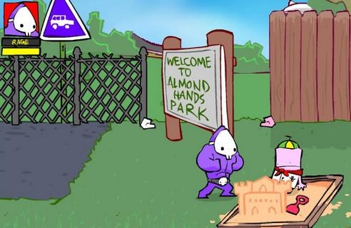 3、然后会看到1个秋千小豆丁、一个普通少年,和一个头盔小豆丁。绕到头盔小豆丁后面,别用飞天击浪费时间,用两个方向键+不放的S(冲撞)可以直接将他打倒天上(需要前面飞天击的激活),直接死亡。就可以把剩下两个小豆丁虐死了。