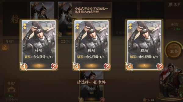 当玩家的手牌中和场上共计有三张同名武将的非金色版本时,这三张武将牌会合成一张该武将的金色版本,同时保留来源的三张武将身上的所有强化效果。金色版本的武将拥有更高的基础攻击力和体力以及更强的技能效果。同时,你可以从三张星级为你的营帐等级+1的武将中选择一张。