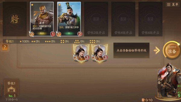 玩家需要上阵武将进行战斗,每位玩家的场上最多同时上场7名武将。武将分为不同的阵营和星级,通常来说,更高星级的武将会拥有更强大的能力。玩家可以在招募阶段从营帐花费3枚虎符招募一名武将加入手中。玩家可以将场上的武将和手牌中的武将拖动到营帐里进行遣散并获得1虎符。